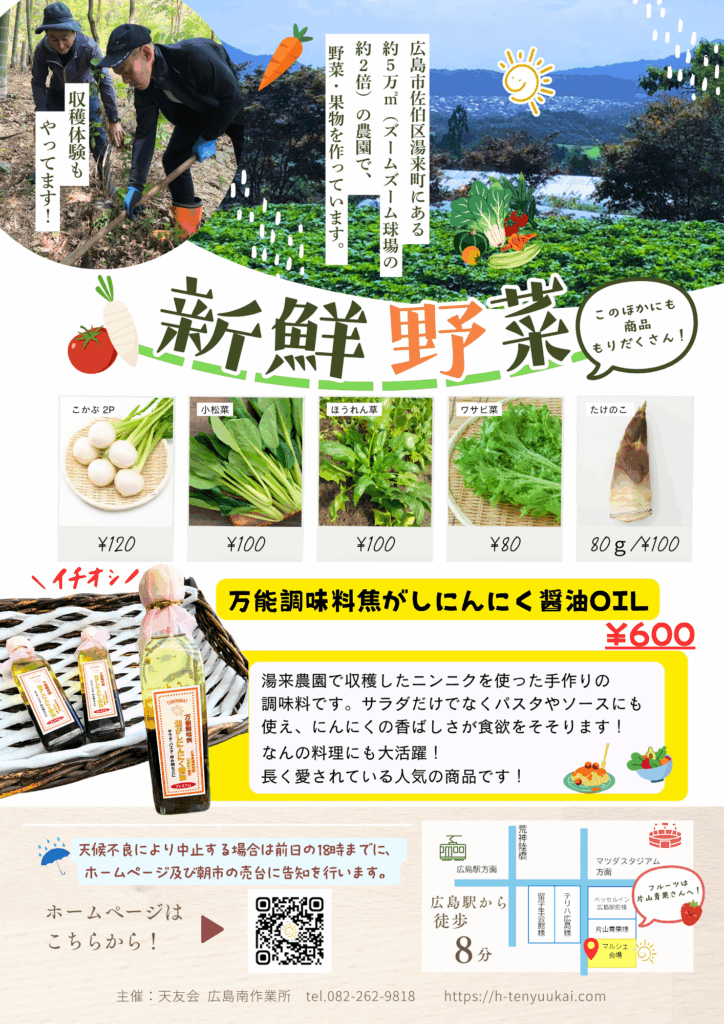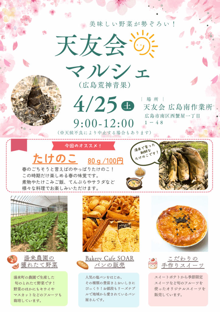 🌸4月25日(土)マルシェのお知らせ☀️ 2026.04.21 4月25日土曜日、9時00〜 天友会マルシェを開催します。今回は農園で採れたタケノコをはじめ、『社会福祉法人 交響 SOAR(ソアー)きつつき』 さんのおいしい手作りパン、パティシェのスイーツ、農園のにんにくを使用した焦がしにんにく醤油などなど、今月も盛りだくさん!春を彩るおいしい旬をお楽しみください。 ぜひ一度天友会においでください!