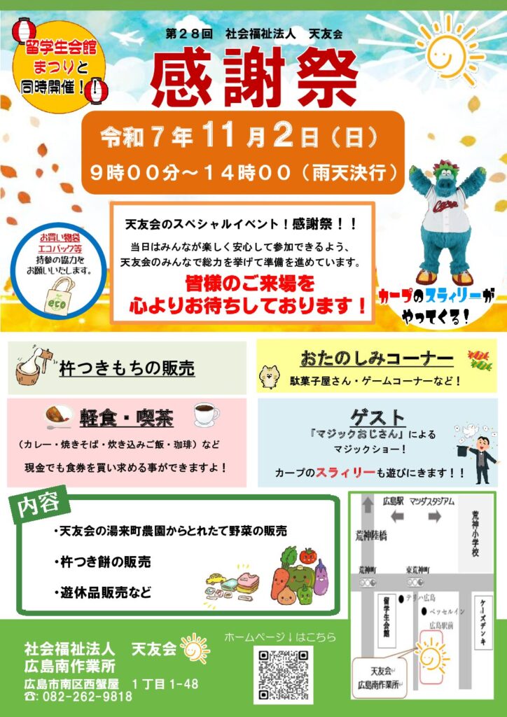 第28回 感謝祭開催のお知らせ 2025.10.06 今年も開催します! 第28回感謝祭 日時 令和7年11月2日 9時00分~14時00分(雨天決行) スペシャルゲストとしてスラィリーとマジックおじさんがやってきます! 皆様のご来場を心よりお待ちしております!